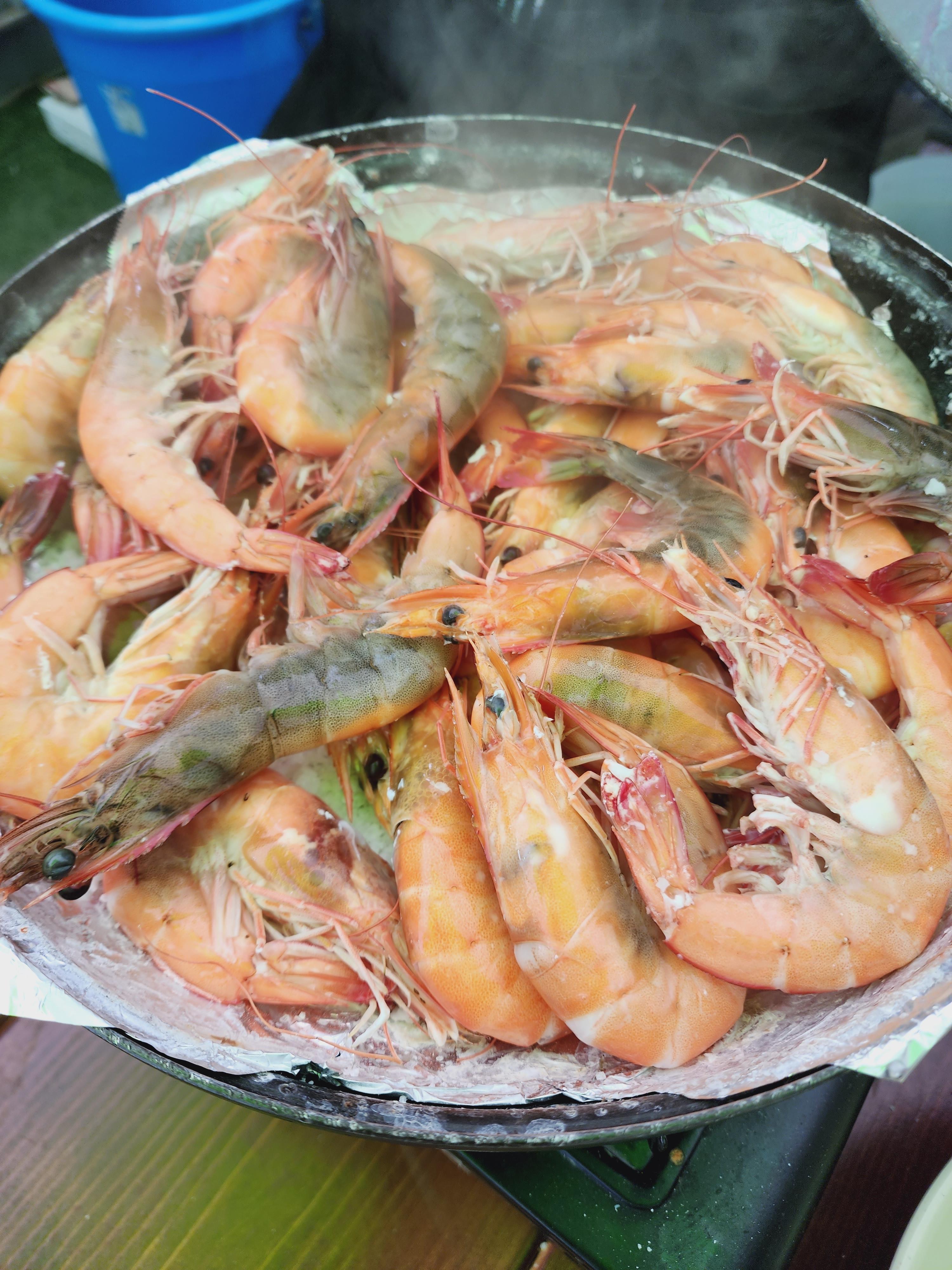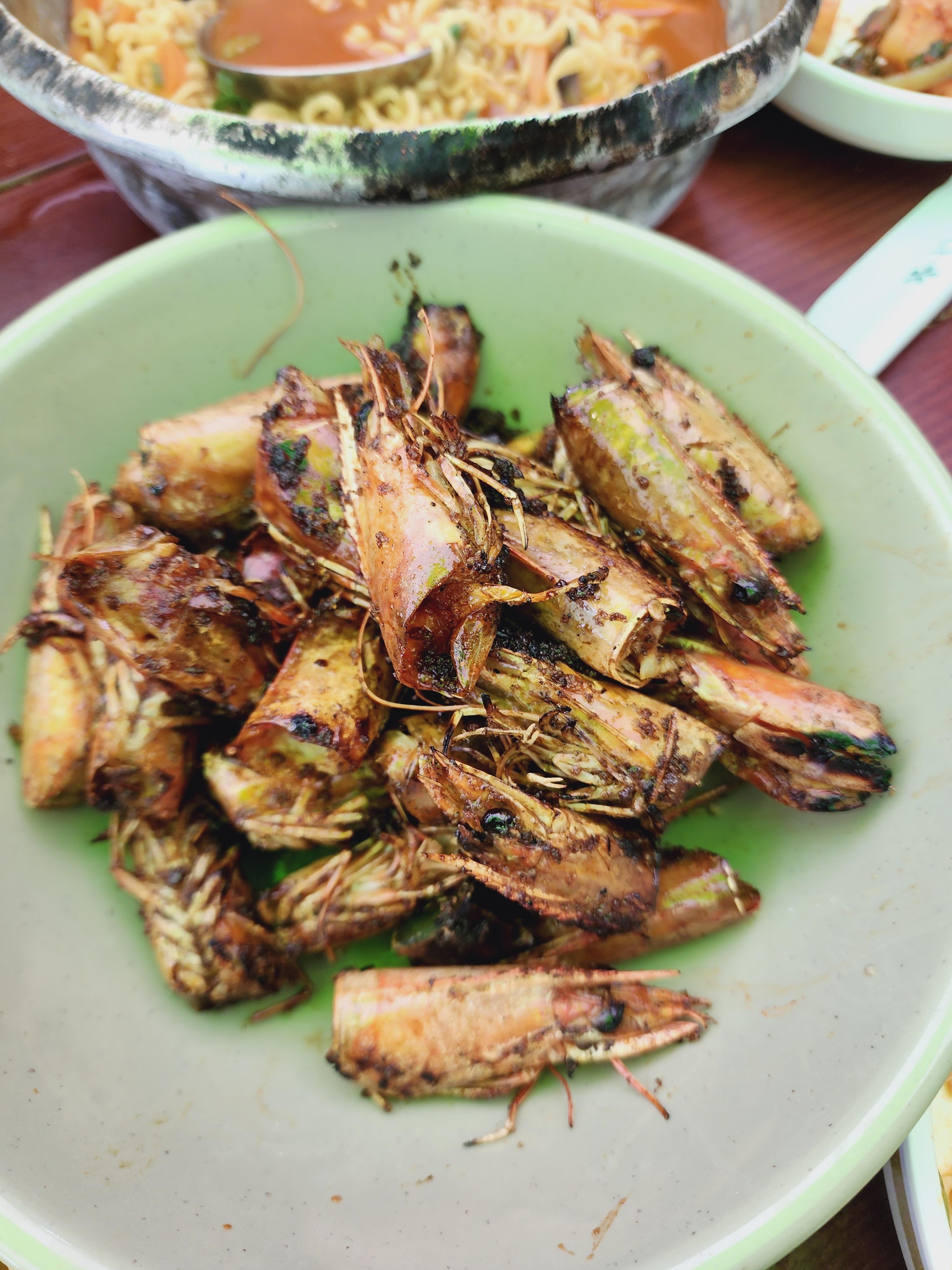 요거요거 아래 사진이 이집 트레이드마크 새우 머리구이예요! 따놓은 새우머리들을 드리면 라면스프?맛과 조미료맛 나는 만정수산 마법가루를 넣고 구워서 주시는데요. 요것땜에도 오시는거 같더라구요.