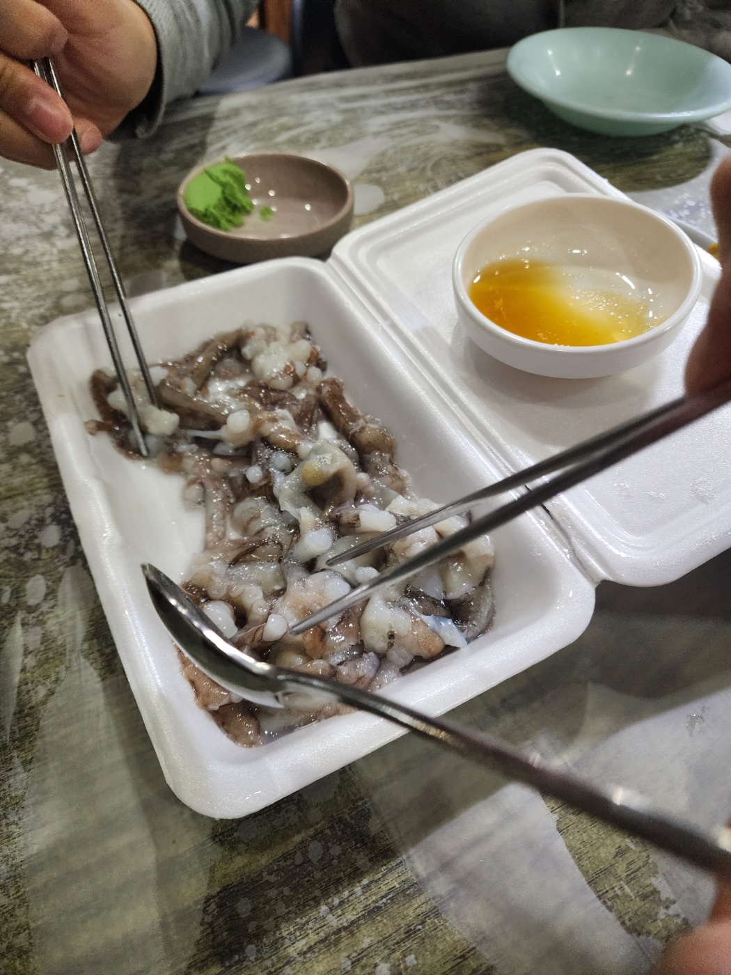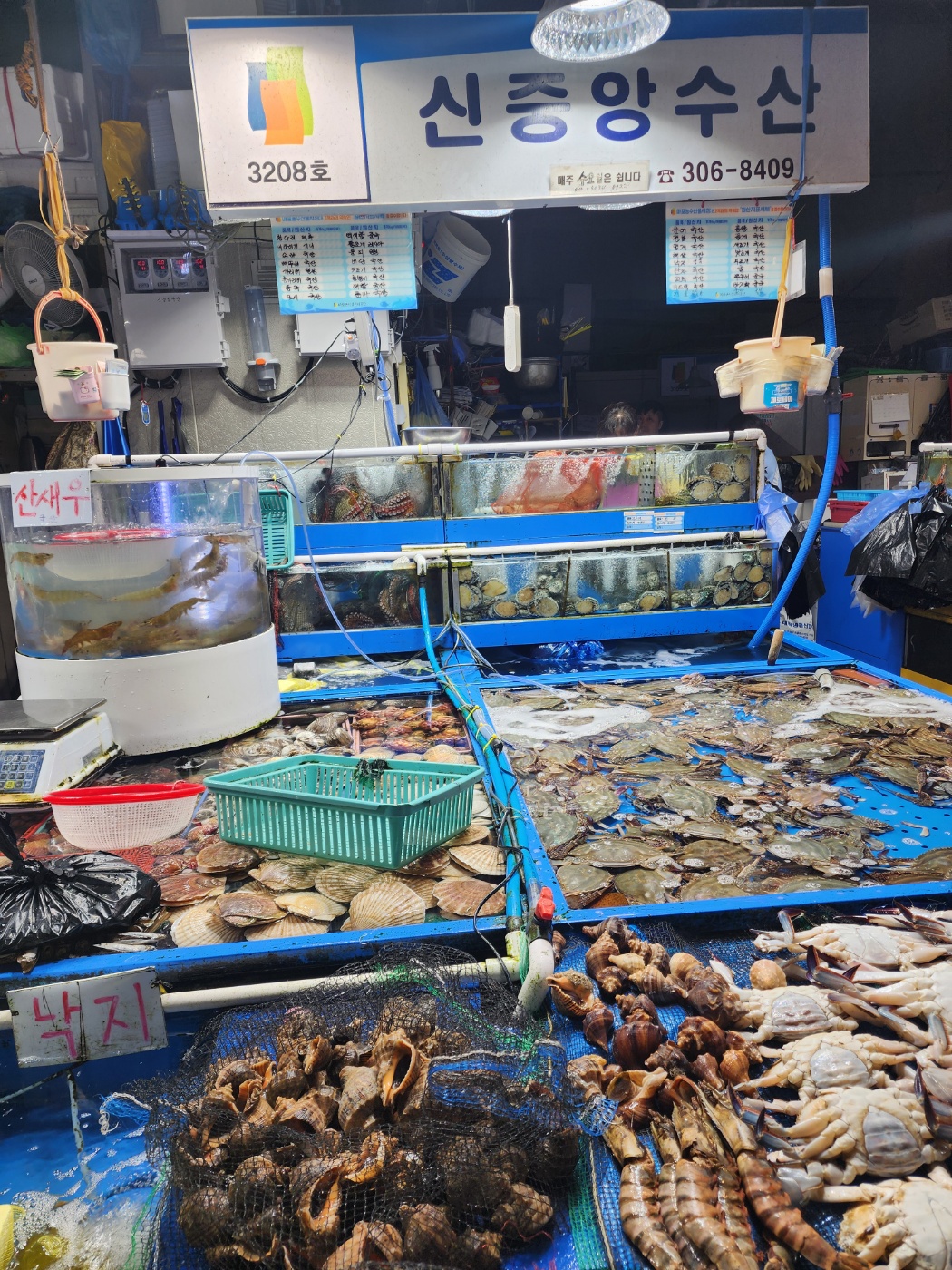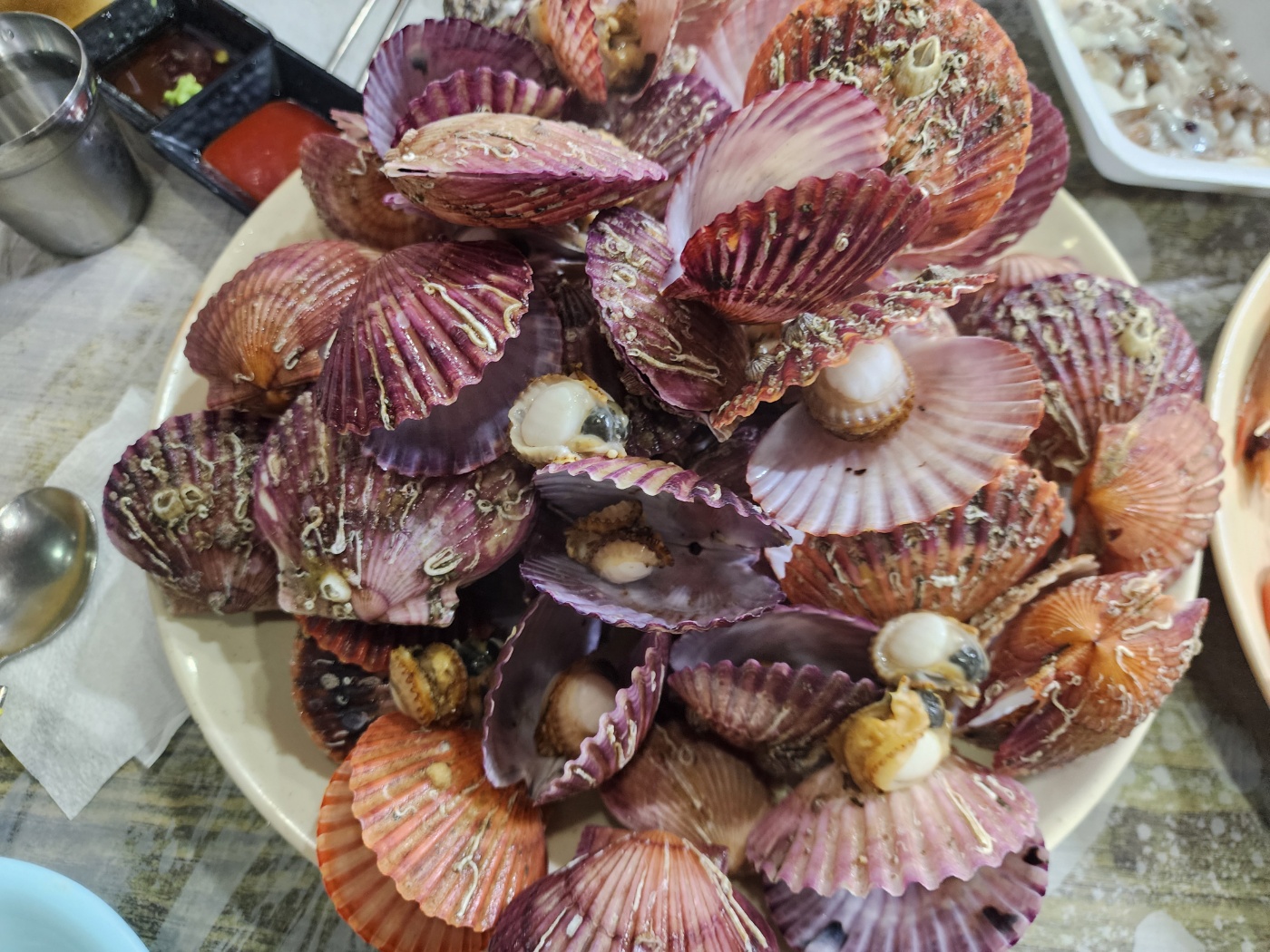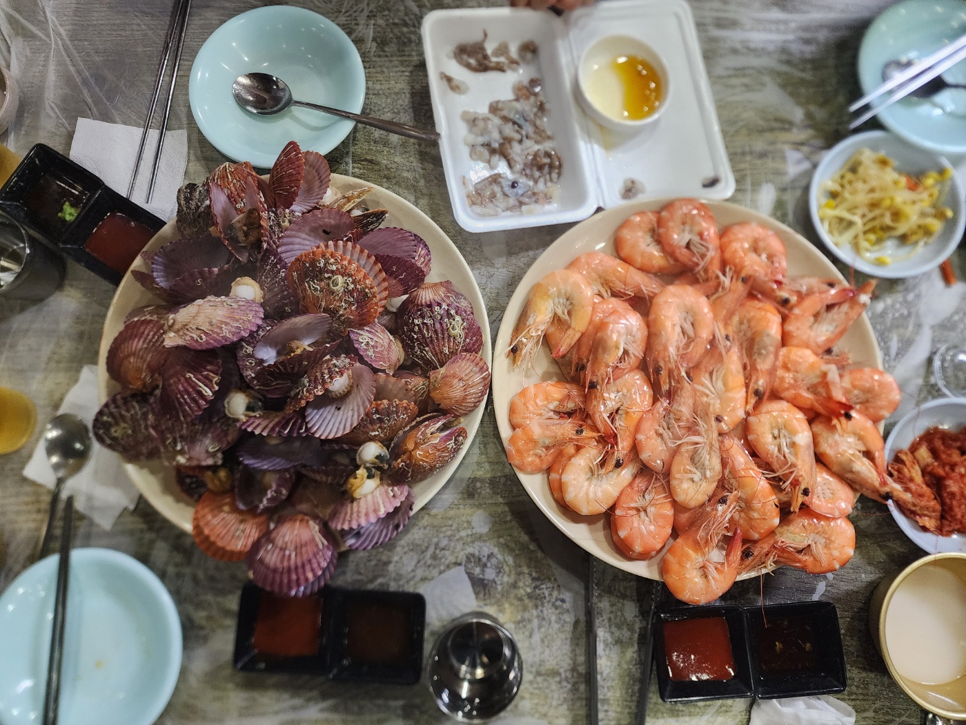 들어오자마자 구매한 해산물을 맡기고 자리를 안내받았어요. 저희는 대하랑 가리비 모두 쪄서 요리했어요! 대하랑 가리비 쪄지는 동안 낙지 탕탕이로 먼저 흡입흡입 오랜만에 먹으니까 쫀득쫀득 입안에 붙는 낙지가 어찌나 싱싱하던지 몸이 좋아질 것만 같은 느낌이더라고요 :) 조리 가격은 보통 kg 금액으로 받는데 아쉽게 사진을 못 찍어 왔네요...