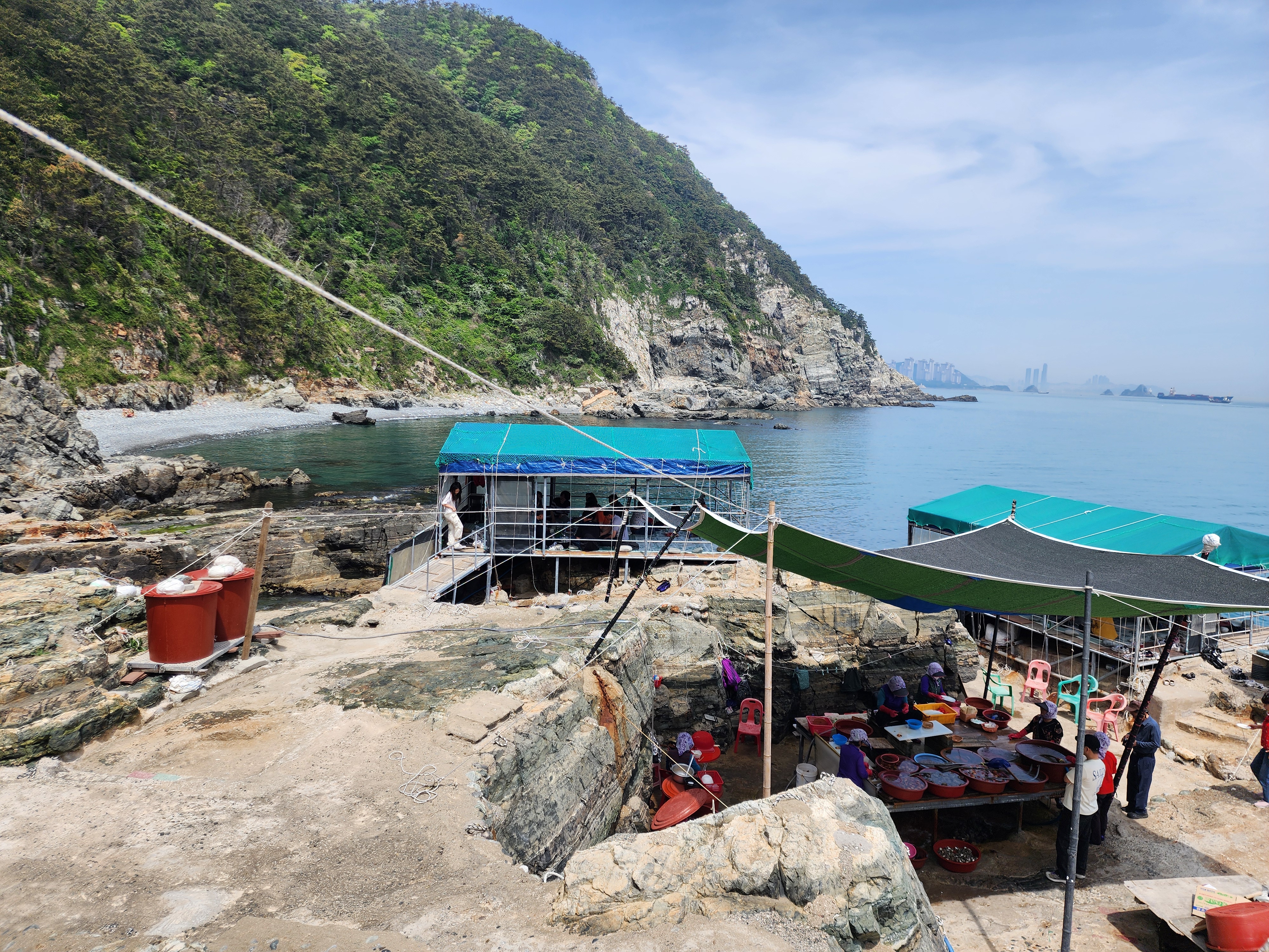 도착하면 정말 소규모의 해녀촌이 나옵니다. 생선보다는  해삼, 멍게, 소라, 낙지 등의 해산물들이 더 많았던 거 같아요. 남동생이 이것저것 섞어서 10만 원 치인가 15만 원인가? 구매했고 손질해서 나오니 2 접시 나오더라고요. 지금 보니 멍게, 해삼, 개불, 뿔소라, 낙지 이렇게 구매했었네요. 주류도 당연히 판매합니다.