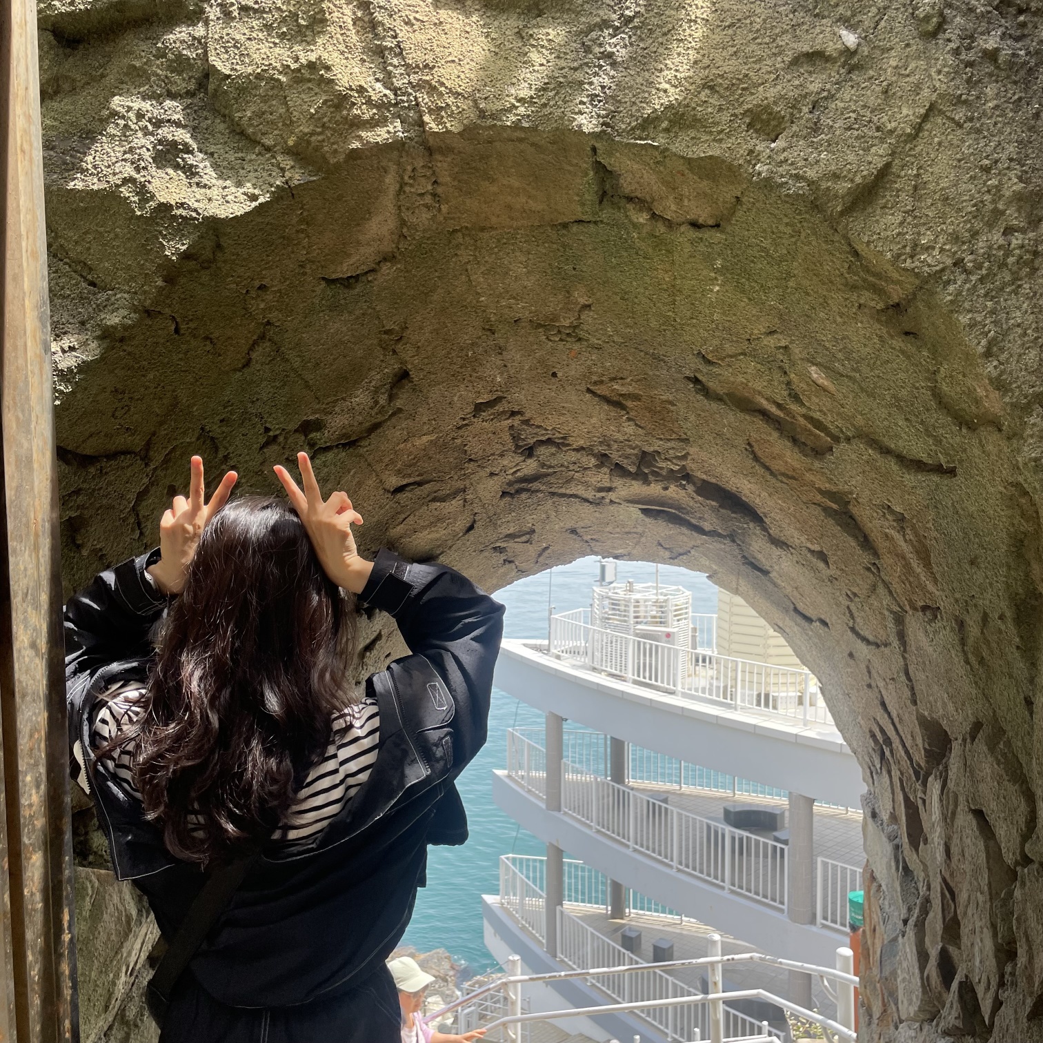태종대 해녀촌은 다누비 열차 타고 전망대에 도착하면 찾아가 실 수 있습니다. 해안 쪽으로 내려가는 이정표를 따라 15분 -20분 정도 쭉 바닷가 쪽으로 나 있는 계단을 내려가 주시면 되는데요. 계단폭이 가팔라 위험하니 안전바를 꼭 잡고 내려가셔야 합니다. 내려가다 보면 태종대 검색할 때 많이 나오는 그리스 산토리니 느낌의 포토스폿도 나오니 인생샷 하나씩들 건지시구요.