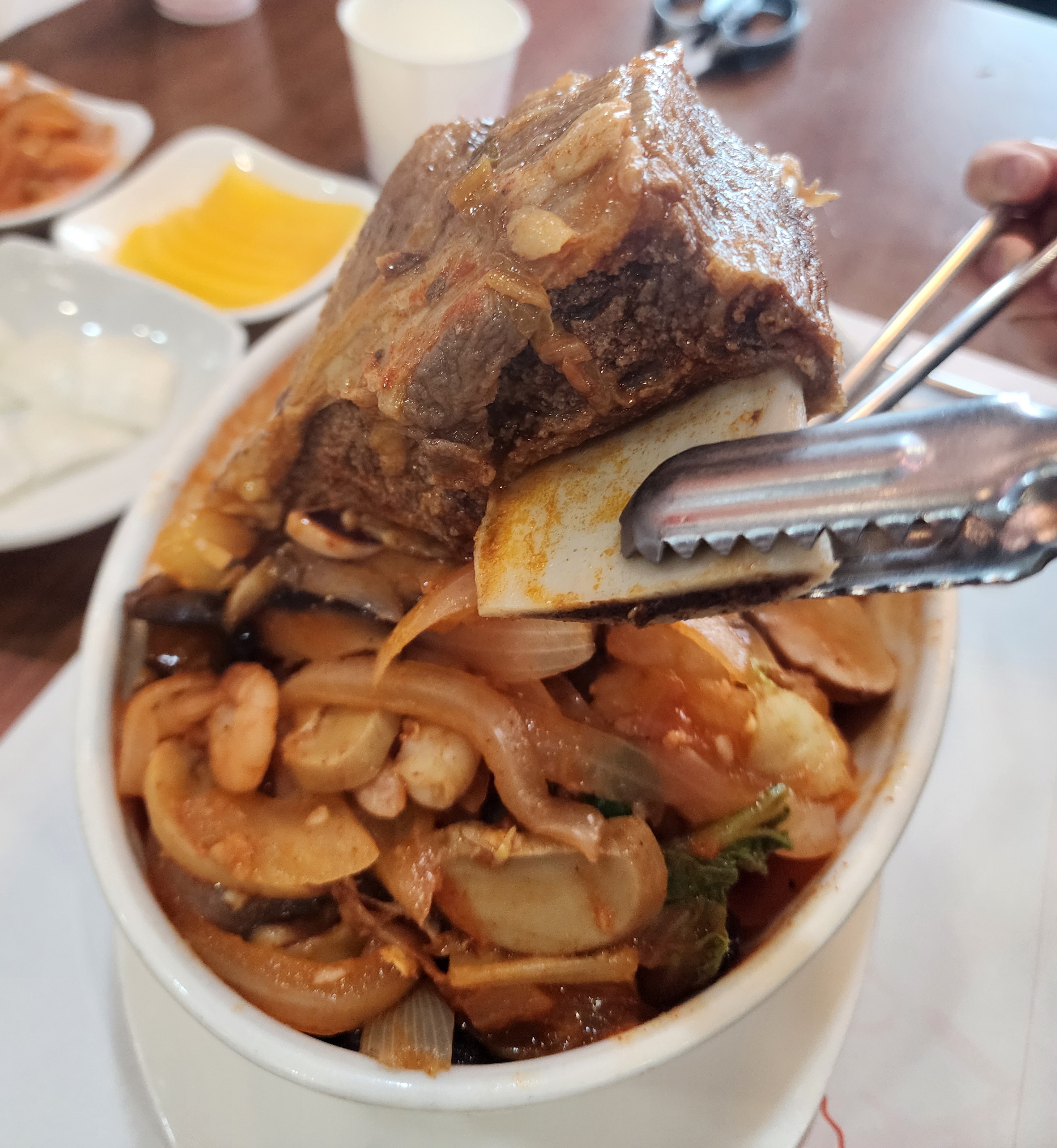 가장 궁금했던 메뉴는 단연 왕갈비짬뽕이었죠. 하루 100그릇 한정 판매라는 소문을 듣고, 그 맛을 꼭 보고 싶었거든요. 짬뽕 국물은 얼큰하면서도 깊은 맛을 자랑하며, 풍부한 건더기와 큼직한 갈빗대가 시선을 사로잡았는데요. 고기는 부드러워서 살이 쉽게 떨어지고, 씹을 때 전혀 불편함이 없었어요. 정말 풍부한 재료와 깊은 맛이 조화를 이룬 훌륭한 메뉴였습니다.
