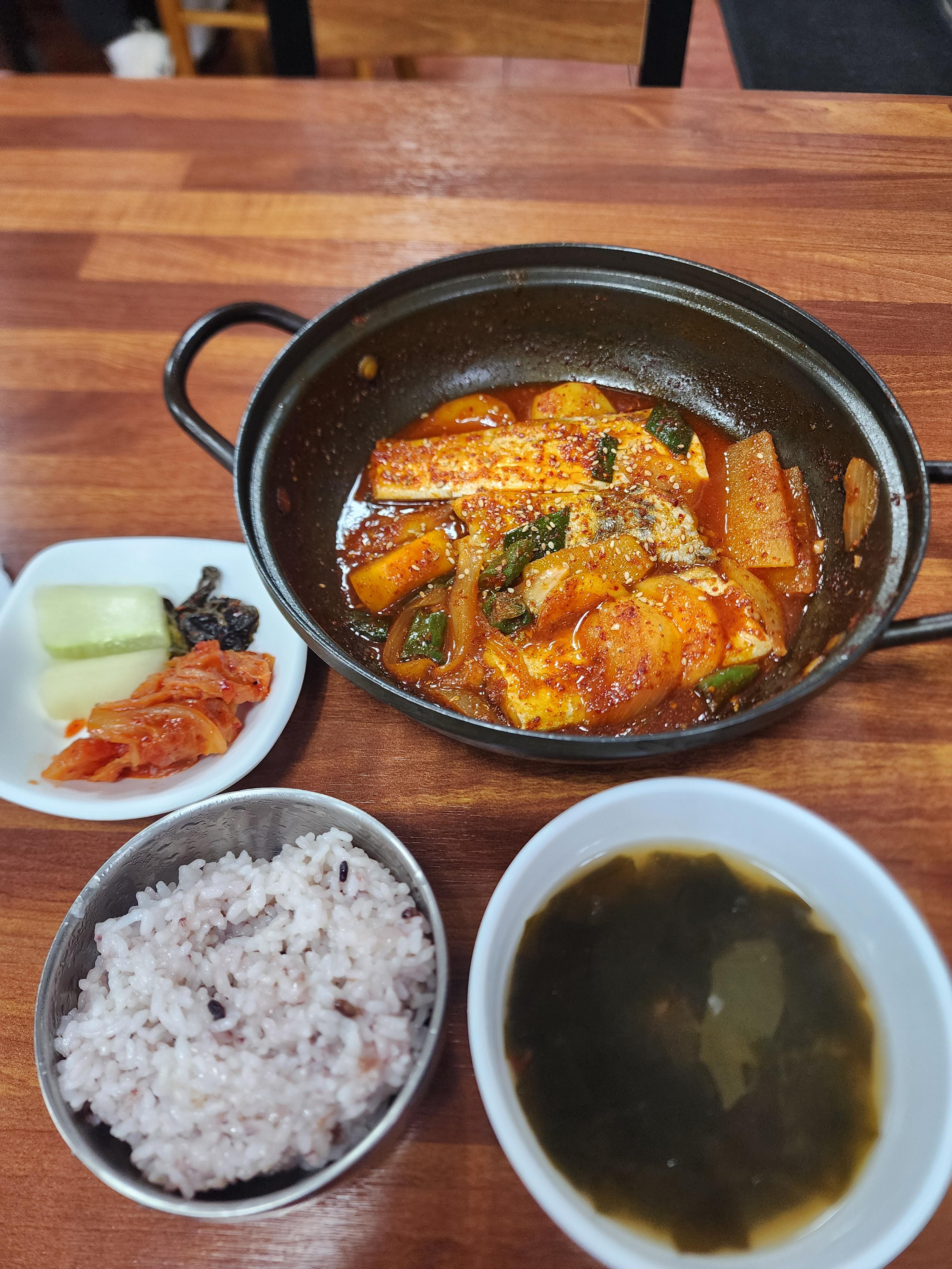갈치조림 맛은?? 칼칼보다는 달달한 조림맛이었는데요, 첫맛에 달다고 느껴지긴 하더라고요 그렇다고 너무 달지만은 않고 짭조름한 맛과 고춧가루의 맛이 잘 조화되어서 맛있더라고요. 감자도 포슬포슬 달달하고 무도흐들흐들 ♥ 밥이랑 갈치랑 잡곡밥에 얹어서 먹으니 극락이었습니다. 밑반찬도 직접 만드셔서 오이장아찌랑 볶은 김치, 나물도 맛있게 잘 먹었어요. 집밥 먹는 느낌이라 편히 맛있는 한 끼 하고 왔습니다.