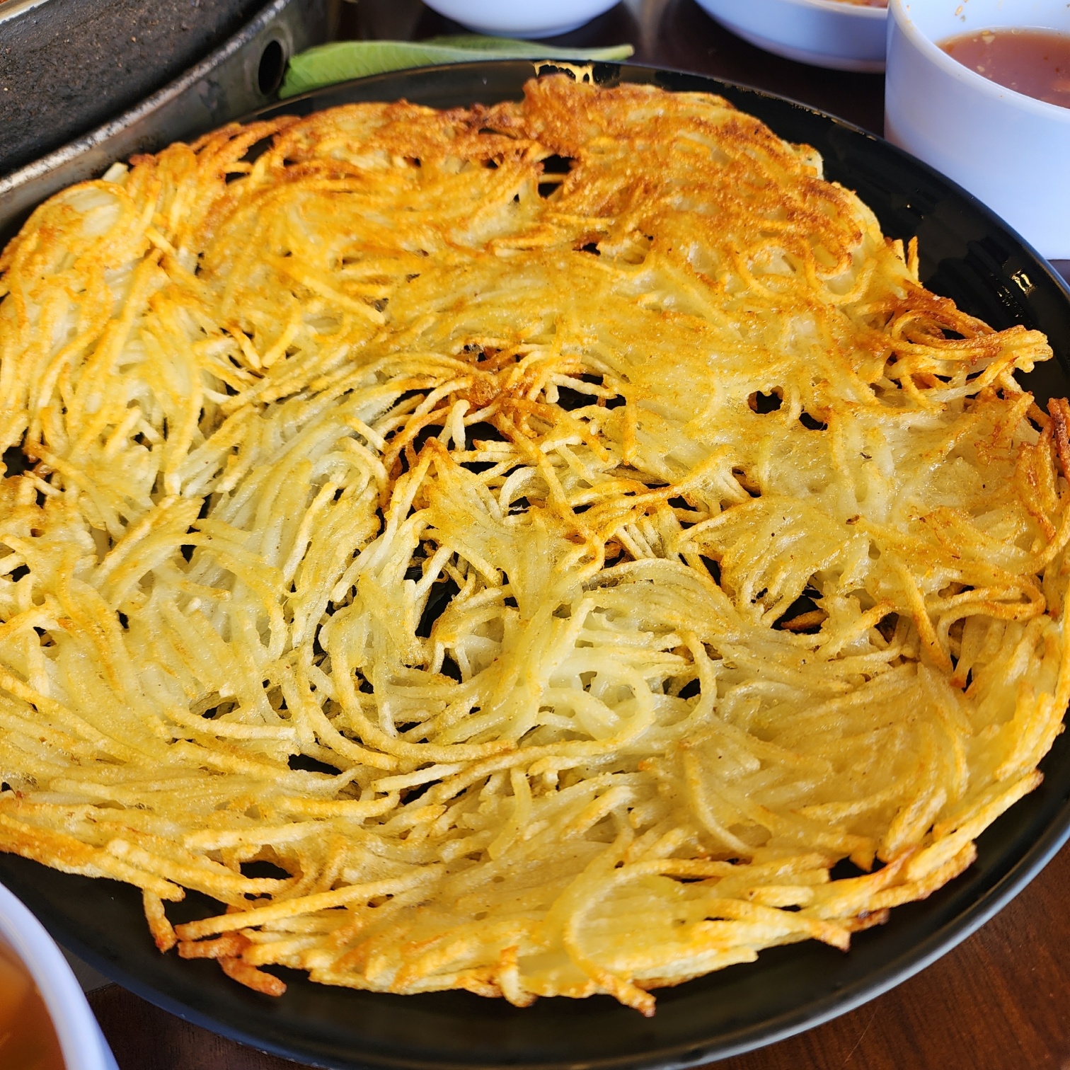 감자체전은 바삭바삭해서 너무 좋았어요! 저는 바삭한 식감을 개인적으로 좋아하는데 감자채가 노릇노릇 익어가지고 감튀처럼 끝부분들은 바삭하고 가운데 부분들도 촉촉하면서 생감자 느낌이 아니라 잘 익어서 바삭한 튀김과 전의 중간 느낌이 너무 좋았습니다.