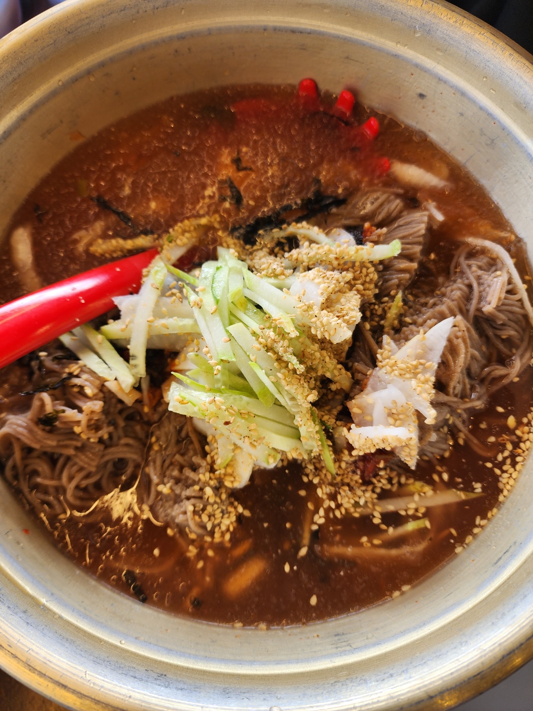 통나무 닭갈비집의 킥은 막국수랑 감자채 전인 거 같은데요. 전 이 두 가지 음식이 글 쓰는 지금도 생각이 나네요. 기대가 없어서 그랬나 물 막국수는 너무 맛있게 잘 먹었어요! 볶음밥 보다도 맛있었다는... 참기름 맛이 확 나면서 입맛 도는 상큼함과 새콤한 참기름향 나는 면발과 국물을 같이 먹으니 동치미보다도 시원하더라구요.