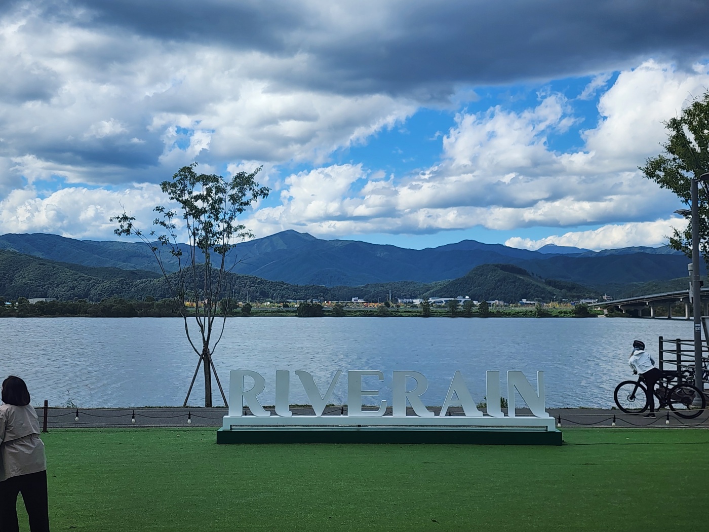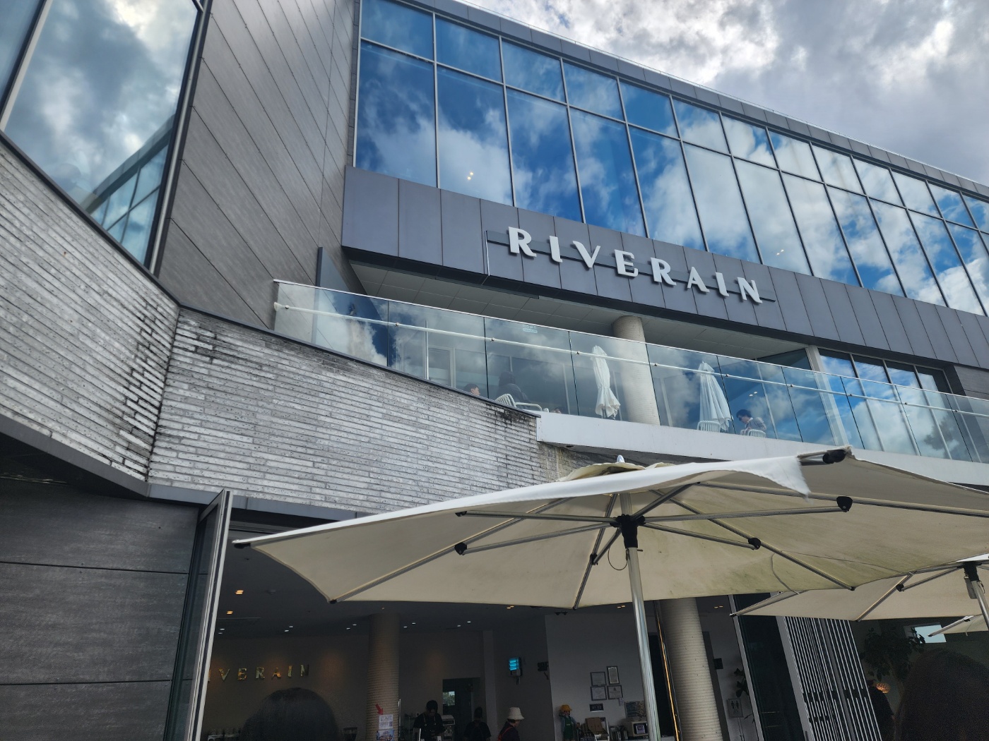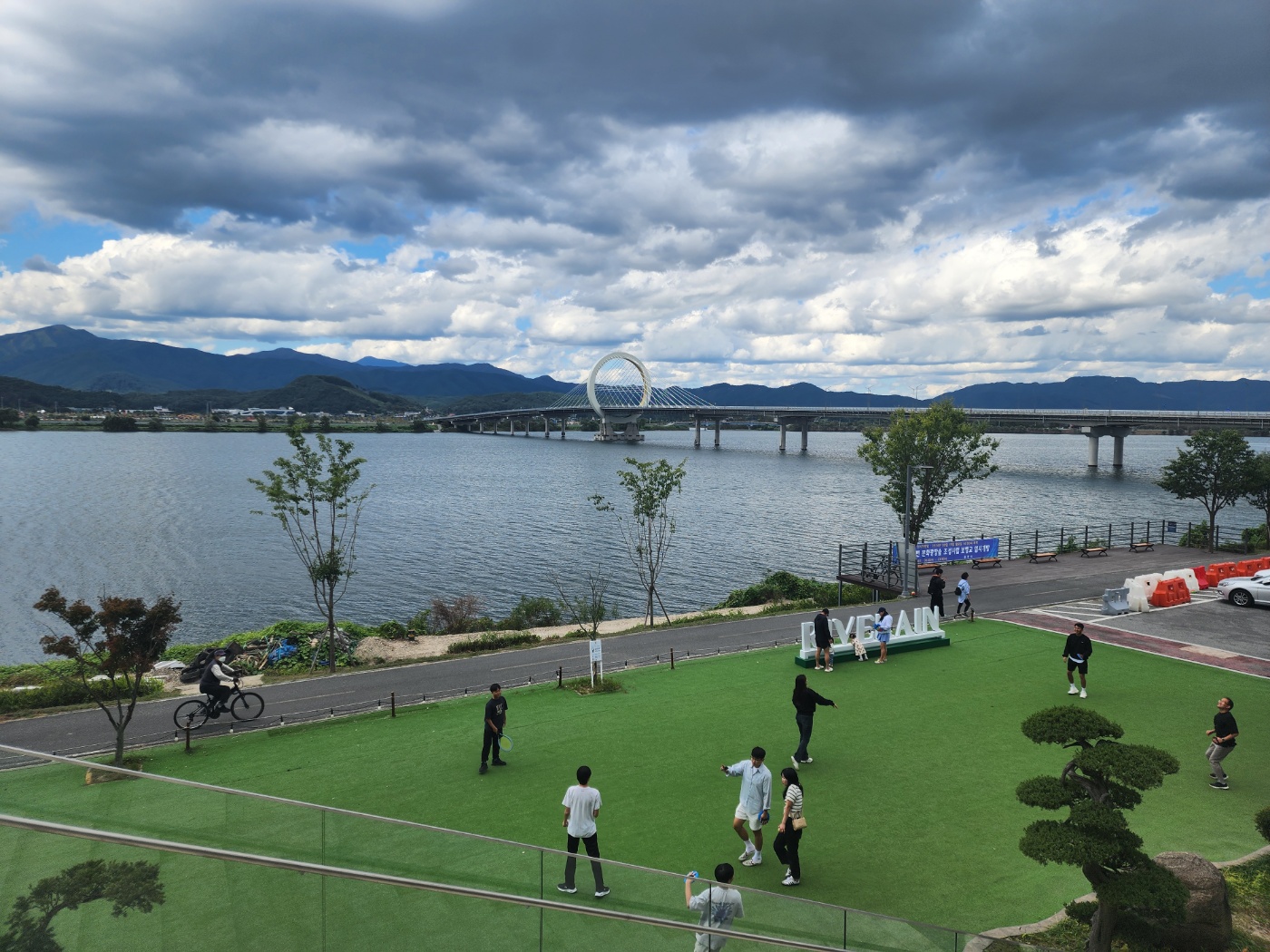 빵류는 못 찍었네요... 두둥 베이커리랑 케이크류도 파니까 둘러보시고 같이 드시면 좋을 것 같아요! 많은 종류를 파는 건 아닌데 빵 모양은 엄청 맛있게 생겼더라고요 ㅎㅎ 비주얼 합격! 풍경을 즐기기 위해 일단 야외 테라스에 앉습니다. 저희 도착했을 때 갑자기 날씨가 흐릿흐릿해지고 바람 쌀쌀해져서 추웠는데 일단 앉아! 그리고 나중에 안에 들어가지 뭐 ㅎㅎㅎ 리버레인이 좋은 점은 저기 초록색 인공잔디가 꽤나 넓은데 저기서 캐치볼, 배드민턴을 할 수 있어요! 리버레인에서 캐치볼이랑 놀이용 배드민턴을 준비해 놔서 아무나 다 빌려서 사용할 수 있어요! 아이들이랑 또는 연인들끼리 하시는 분들이 많더라고요.