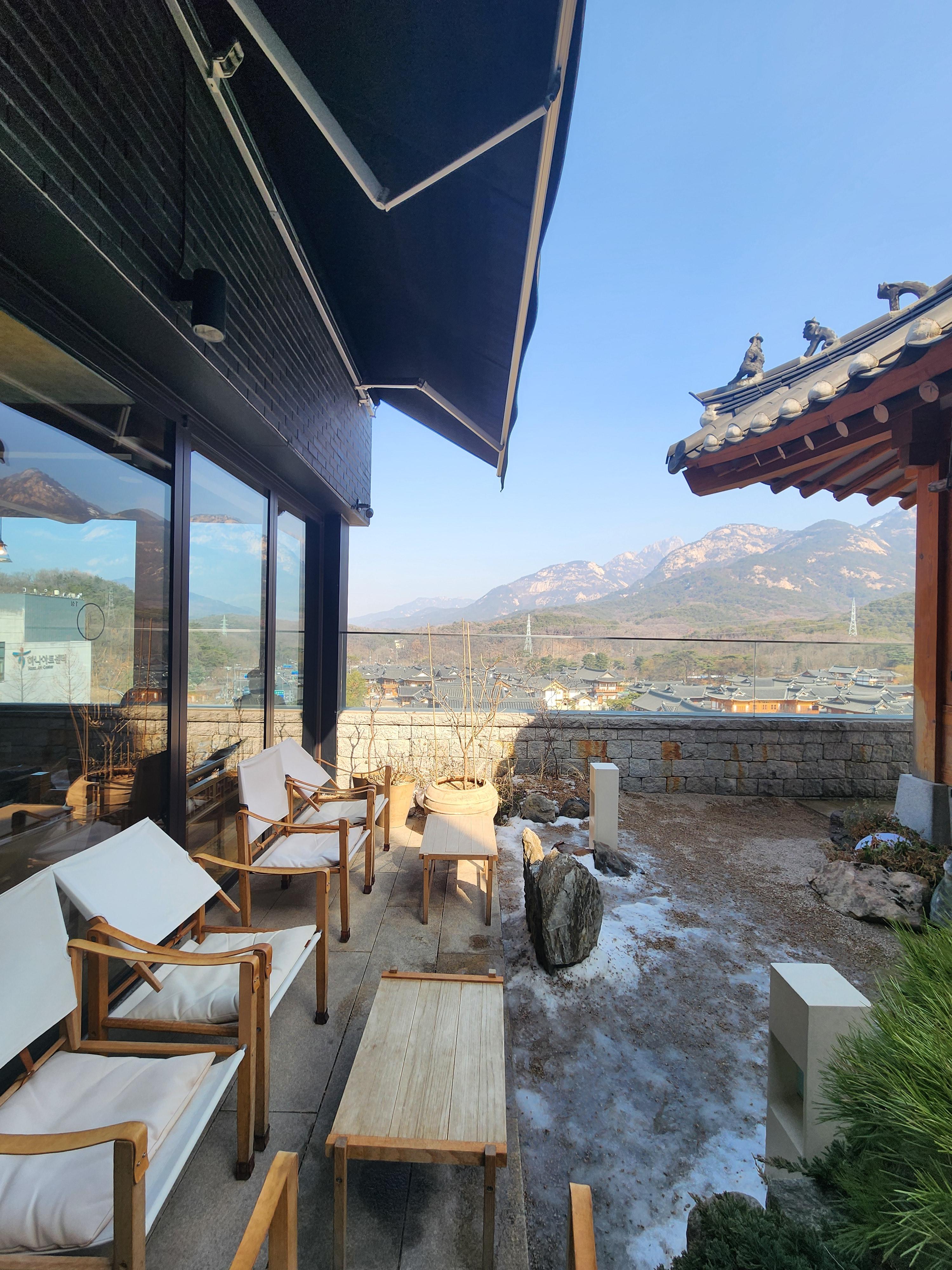카페 바로 앞쪽이 한옥마을이다 보니, 게스트하우스에서 숙박을 하거나 동네 구경을 하러 오시는 외국인 분들이 많았습니다. 한국분들도 많지만 외국인 분들이 더 많더라고요. 통창 뒤로 보이는 한옥마을과 북한산 배경이 마치 옛날 조선시대에 와 있는 이색적인 느낌 때문인 거 같아요. 외국친구들이 한국에 놀러 오면 가볼 만한 장소로도 추천할만했습니다.
