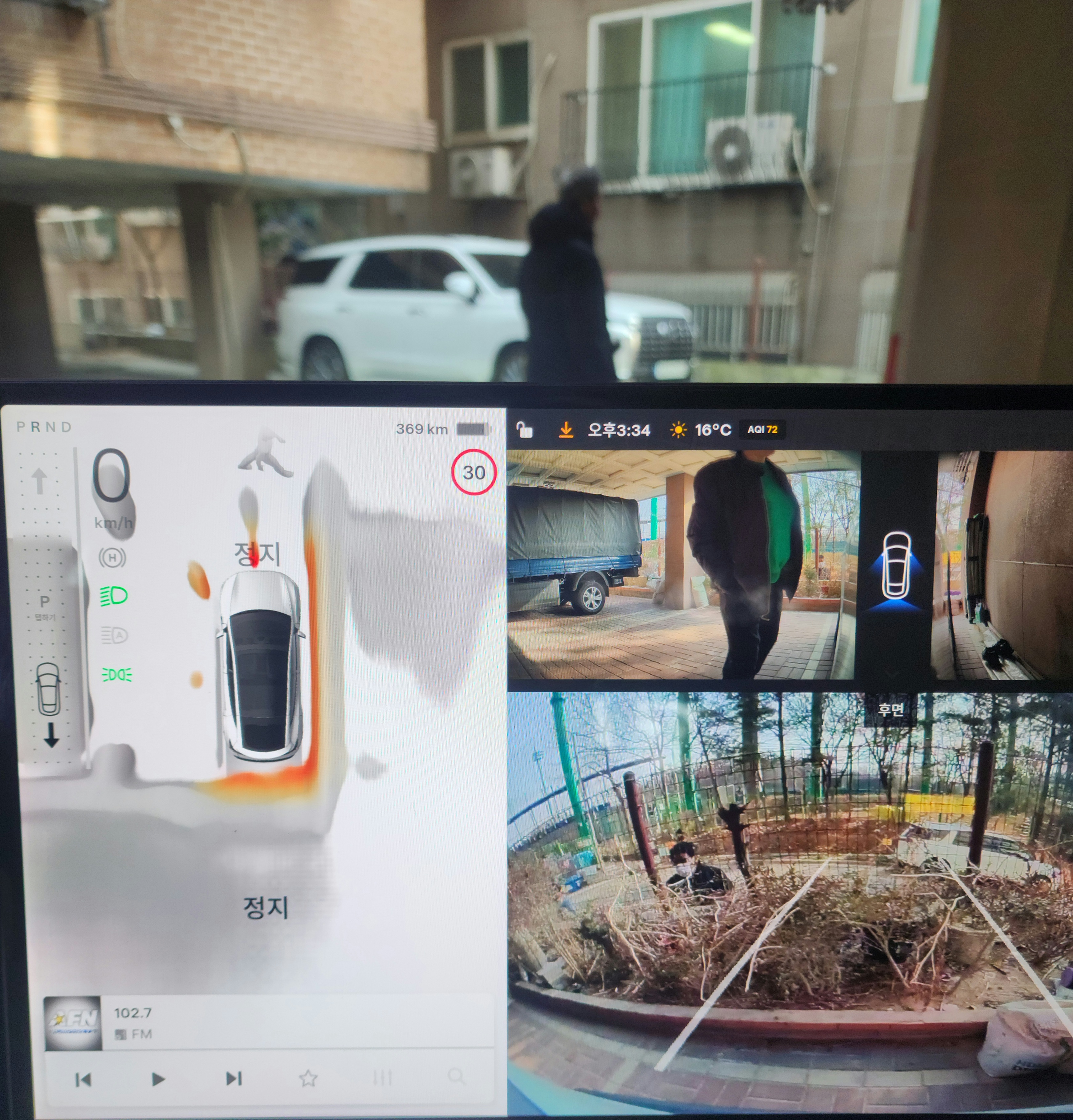 2. 후진을 살짝 진행하다 보면 주변에 사람이나 물건이 있을 때 아래 이미지와 같이 정지!라는 문구가 뜬다.